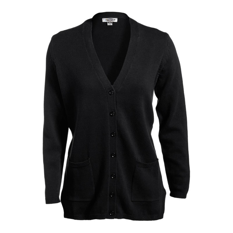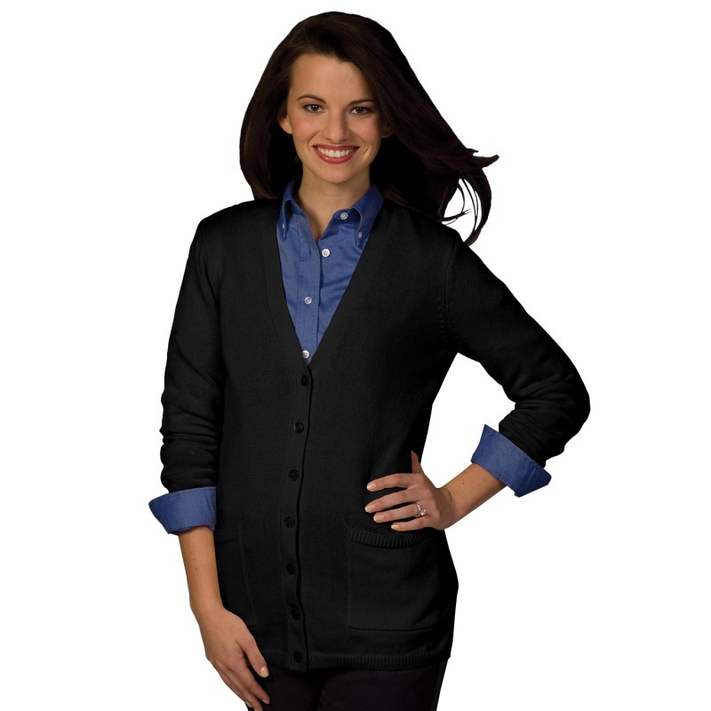 87% Cotton/13% Nylon Traditional fit Long V-neck cardigan Jersey stitch with matching buttons Full fashion with two patch pockets Side vents at hem Cold water wash Ladies' Sizes: XS - 3XL