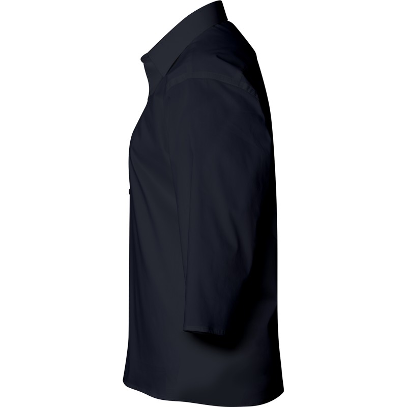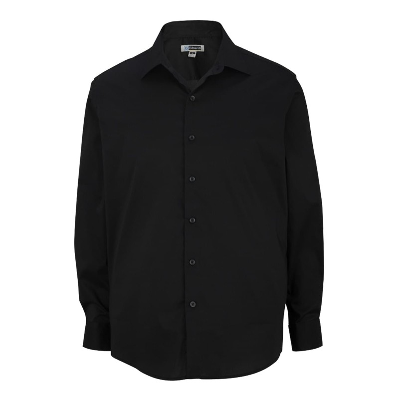 68% Cotton/28% Polyester/4% Spandex; 3.3 oz.wt. Tailored fit that is cut closer to the body Spread collar - 2 3/4” collar points French placket and no pocket Fabric has comfort stretch Two-button adjustable cuff Wrinkle resistant; machine washable Men's Sizes: Regular; S - 3XL; Tall; MT - 6XLT