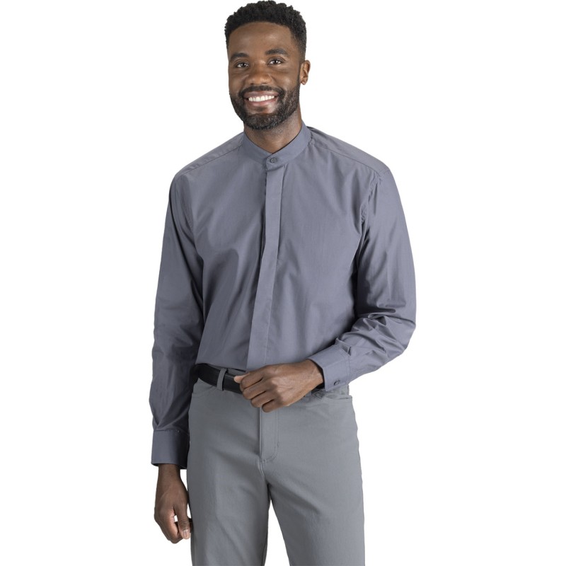 Edwards This men's banded collar long sleeve shirt is soft; colorful and hardworking. This performance broadcloth stands up to demanding wear. Perfect for restaurants; coffee shops or catering. Embroiders well. Companion style is #5396